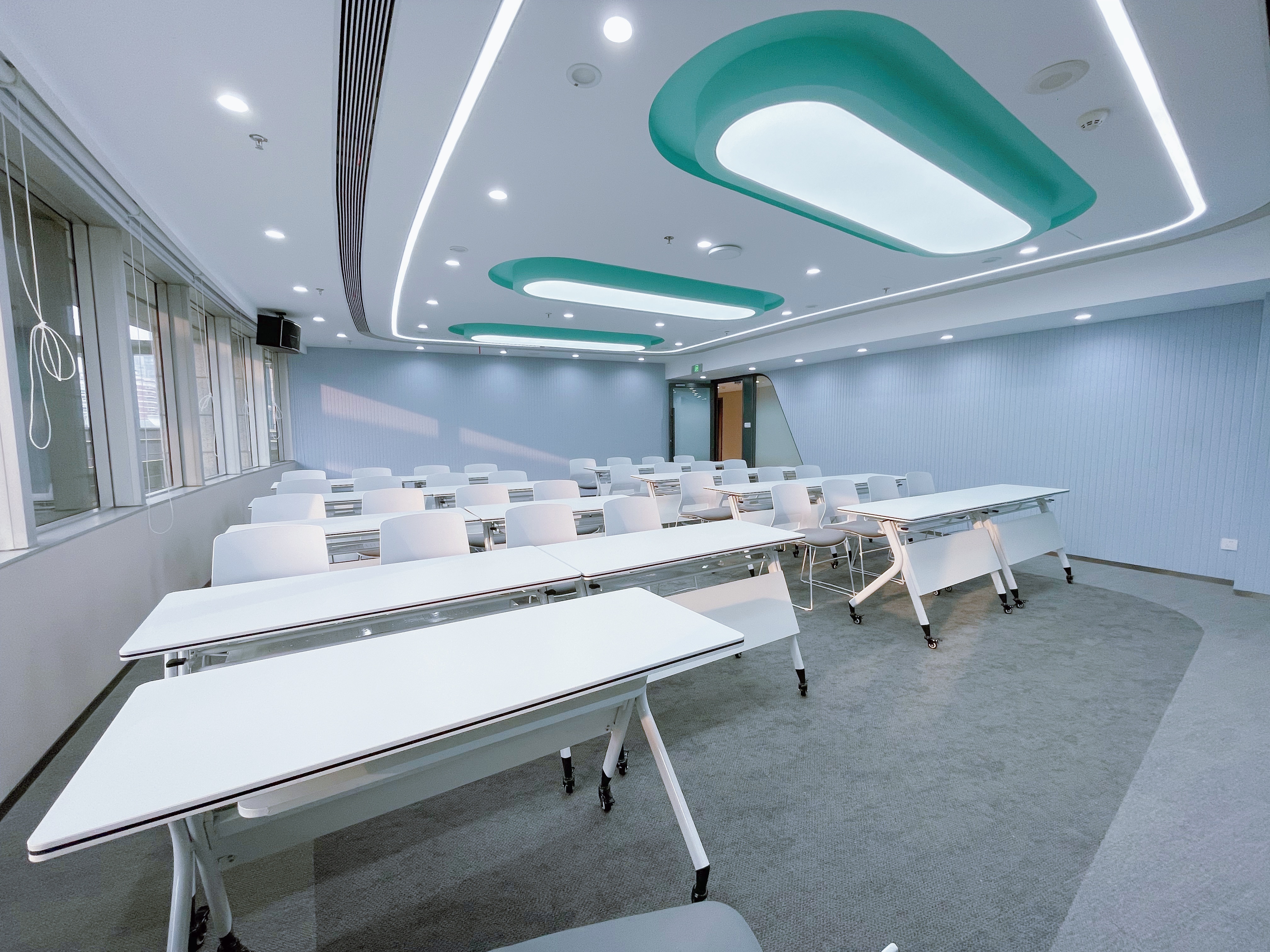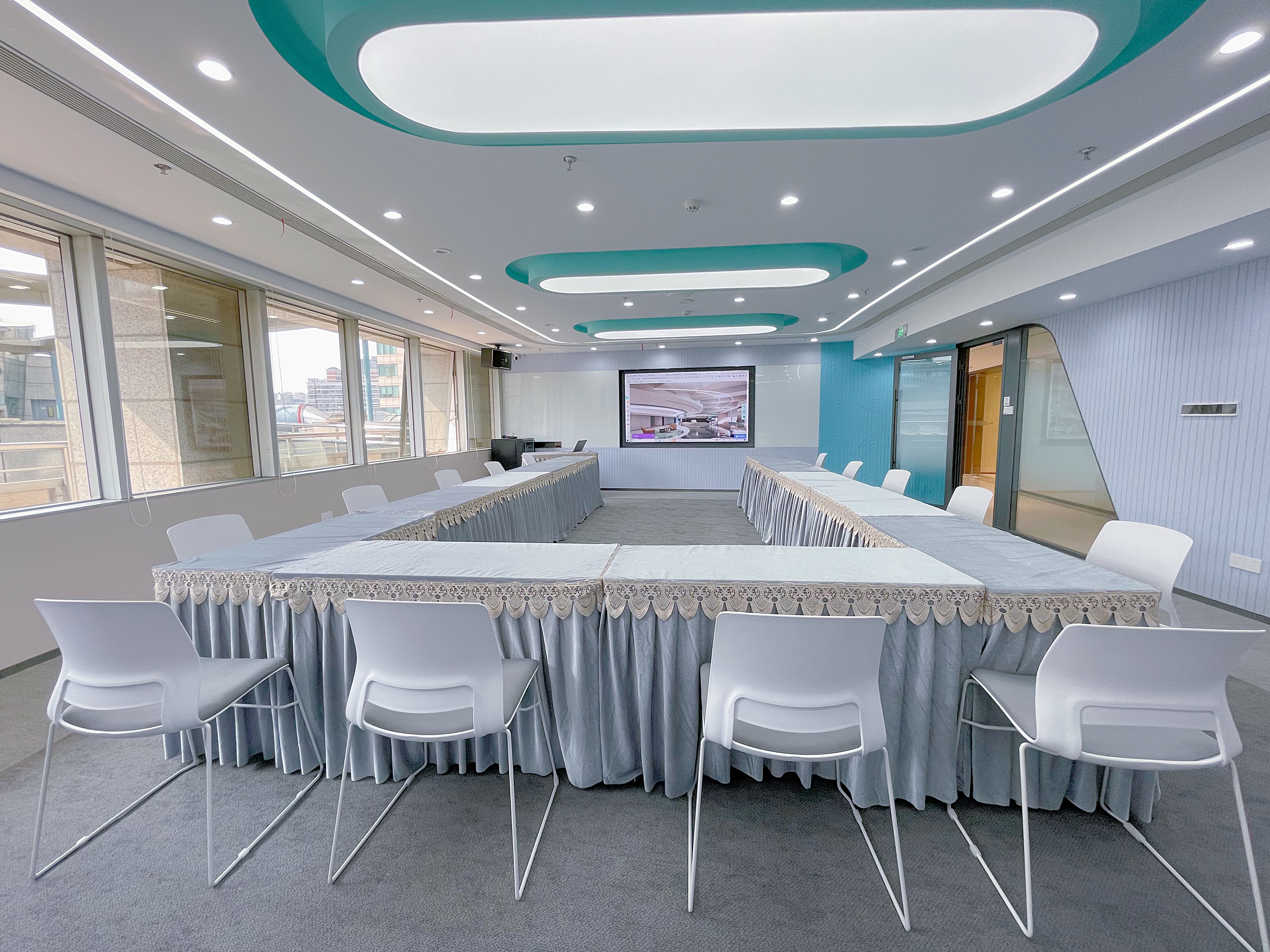 人民广场店,地处黄浦区延安东路港泰广场,紧邻人民广场地标,地铁1、2、8号线直达,出地铁口步行几分钟就能到达,不管是本地参会还是跨城赶来的伙伴,都十分便捷,这也是它最受欢迎的一点。门店整体设计简约大气,融入了自然光线和简约肌理元素,打破了传统会议室的沉闷感,既有商务的专业质感,又不失温馨。店内会议室规格齐全,容纳人数覆盖广泛,精准适配不同场景需求:小型私密洽谈室可容纳4-6人,适合一对一客户对接、核心小组密谈;中型研讨室分为两种规格,分别可容纳10-15人和18-25人,还有大型的50-100人的场地,前者适配小团队头脑风暴、部门例会,后者适合小型商务研讨、小型培训,每间会议室都能保证参会者有充足的活动空间,不会显得拥挤。